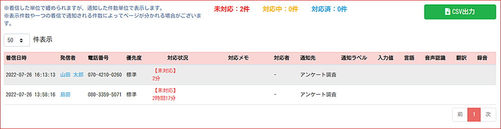対応状況が「未対応」や「対応中」のお電話について、初めて着信したときからの「経過時間」がわかるようになりました。